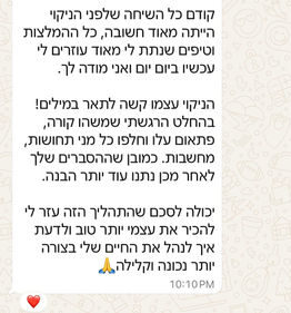 לאחר התהליכים אנשים מדווחים על שינוי משמעותי בחייהם: יותר שלווה, איזון, שמחה ומיקוד. הם לומדים להכיל ולקבל את המציאות, ומרגישים שרמת המודעות שלהם עולה